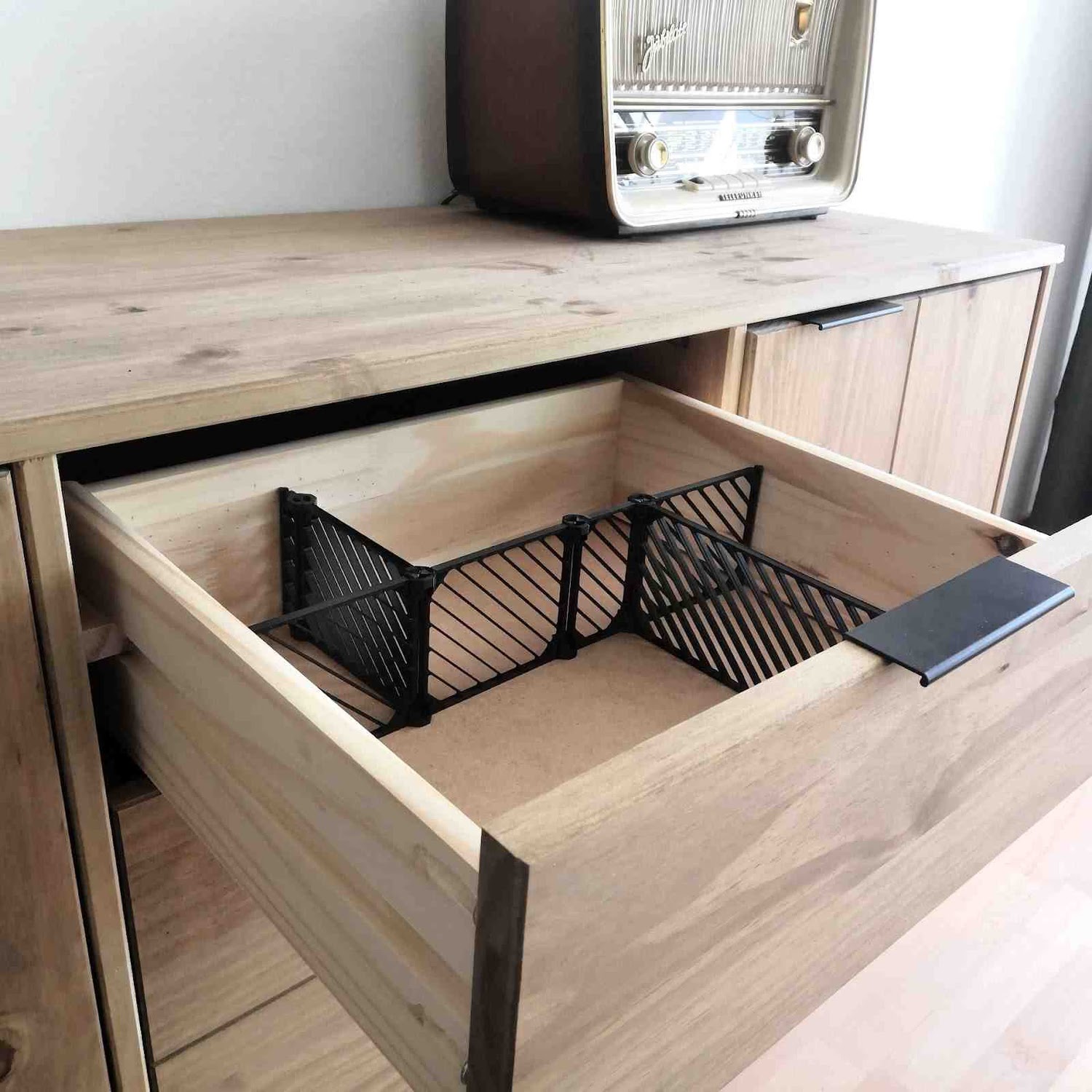 The brackets are 190x50x190 mm. They are perfect for a 20 cm or 8 inch wide board. You can freely choose the length and thickness of your board.