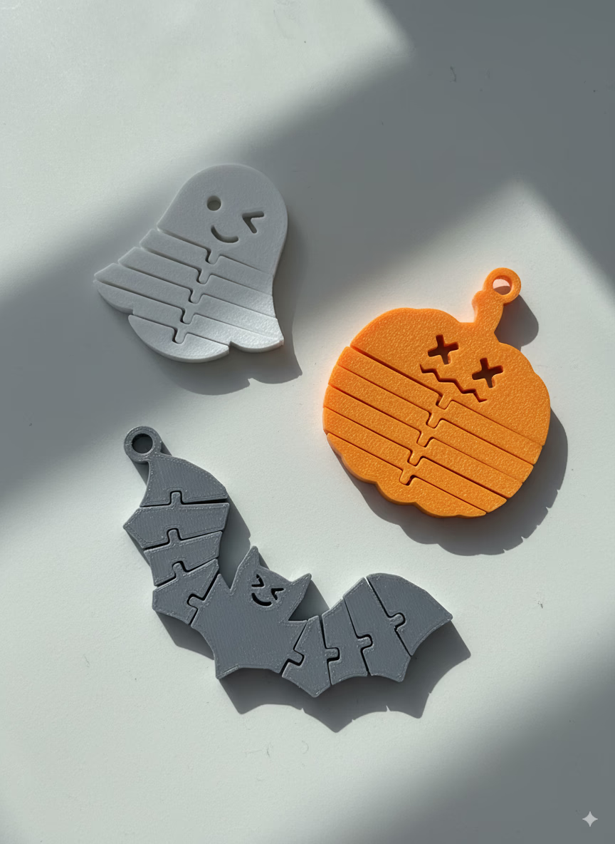 A playful set of flexi keychains featuring a ghost, a pumpkin, and a bat — each with different faces to match the mood. Print-friendly, fidget-friendly, and perfect for adding a little rattle to your keys this Halloween.